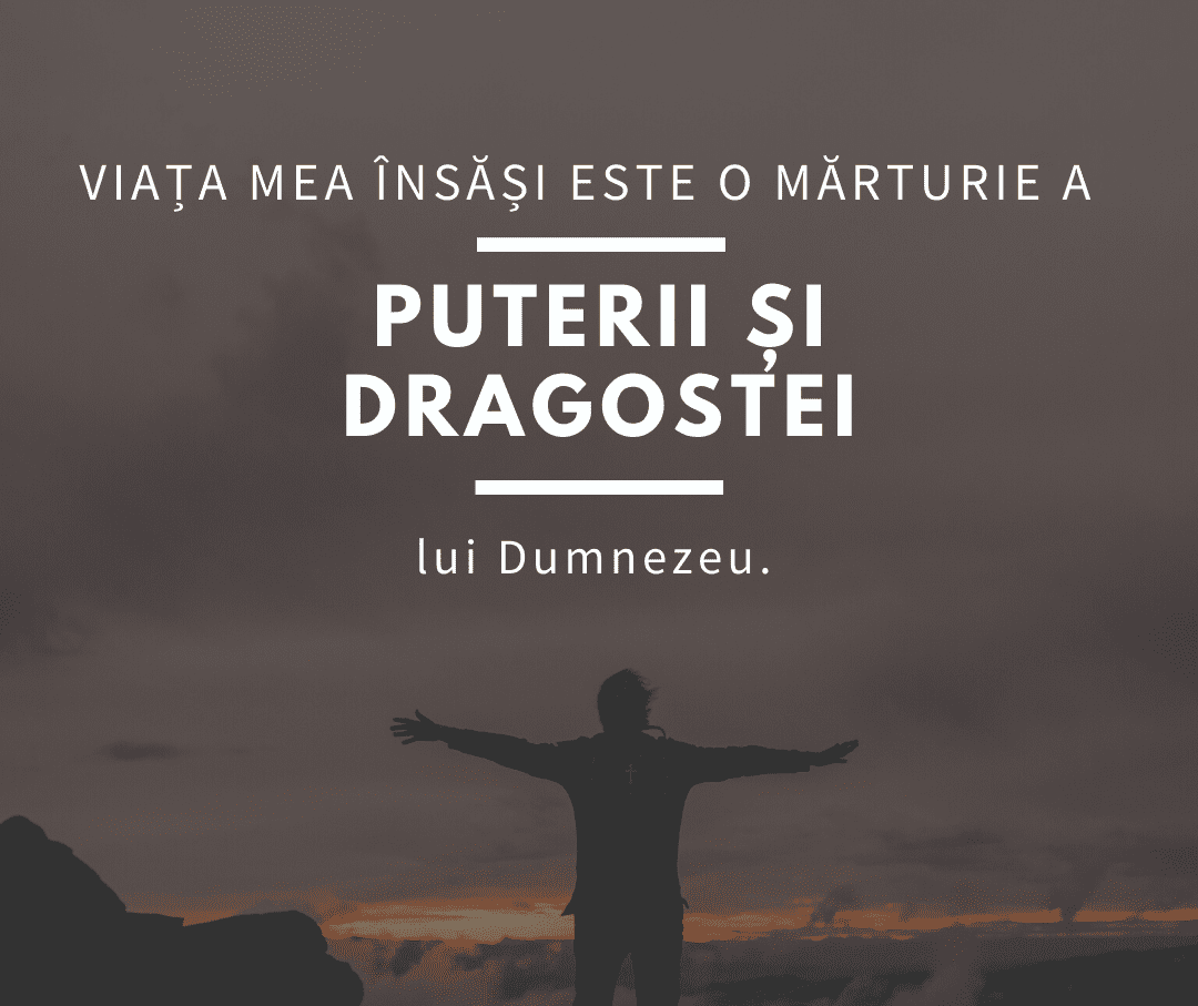 Dumnezeu a fost alaturi de mine in cele mai cumplite momente din viata si m-a protejat inca de cand eu nici nu-L cunosteam. Din momentul in care l-am primit pe Isus in inima, viata mea este o continua transformare. Desi am mai avut perioade cand m-am departat de Domnul, El nu m-a lasat niciodata.