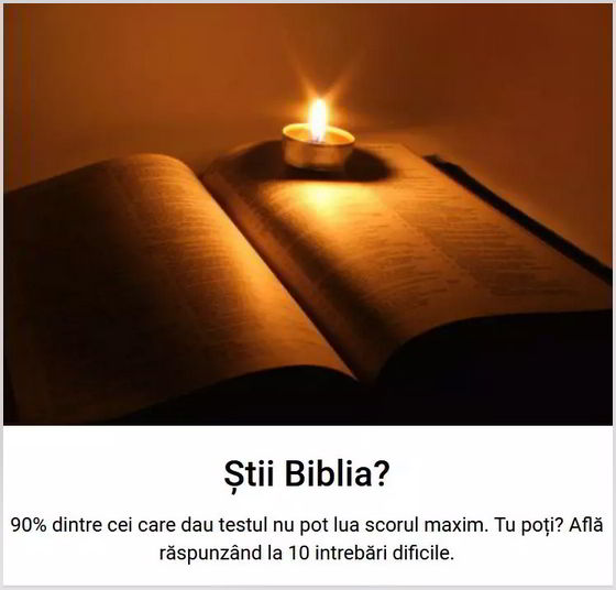 Dacă ai răspuns afirmativ, avem un test pentru tine. Răspunde la 10 întrebări dificile și demonstrează că știi bine Cuvântul lui Dumnezeu. Fă click pe imagine pentru a porni testul.