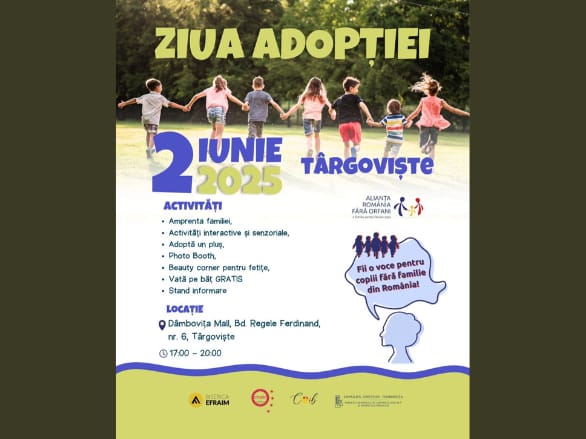 Pe 2 iunie 2025, între orele 17:00 și 20:00, la Dâmbovița Mall din Târgoviște (Bd. Regele Ferdinand, nr. 6), va avea loc un eveniment special dedicat Zilei Adopției, organizat de Alianța România Fără Orfani. Sub mesajul emoționant „Fii o voce pentru copiii fără familie din România!”, evenimentul își propune să aducă mai aproape de comunitate realitatea adopției și nevoia profundă a fiecărui copil de a avea o familie iubitoare.