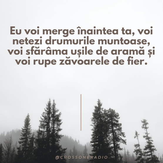 11 Noiembrie 2021 Nov 11, 2021 | Incurajarea zilei Eu voi merge înaintea ta, voi netezi drumurie muntoase, voi sfărâma ușile de aramă și voi rupe zăvoarele de fier.Share on InstagramShare on YouTubeShare on FacebookShare on EmailShare on TwitterShare on LinkedInShare on WhatsApp