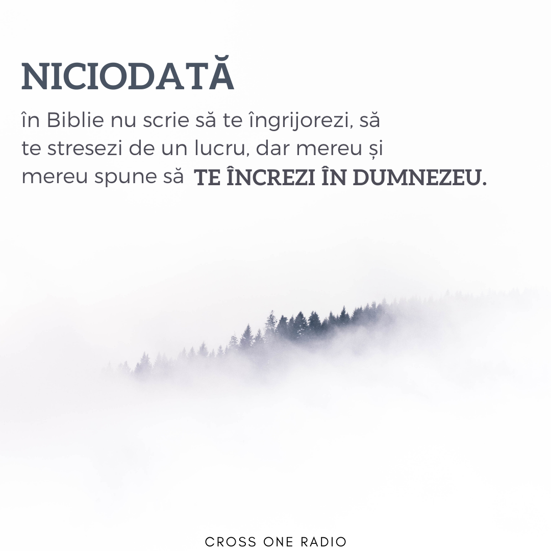 13 Noiembrie 2020 Nov 13, 2020 | Incurajarea zilei Niciodată în Biblie nu scrie să te îngrijorezi, să te stresezi de un lucru, dar mereu și mereu spune să te încrezi în Dumnezeu.Share on InstagramShare on YouTubeShare on FacebookShare on EmailShare on TwitterShare on LinkedInShare on WhatsApp