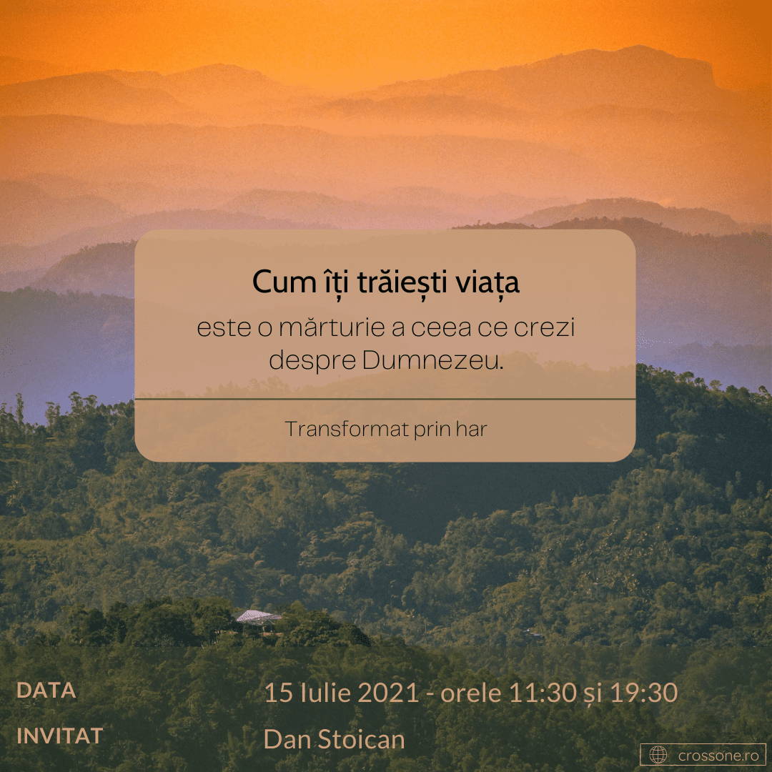 14 Iulie 2021 Jul 20, 2021 | Incurajarea zilei Cum îți trăiești viața este o mărturie a ceea ce crezi despre Dumnezeu.Share on InstagramShare on YouTubeShare on FacebookShare on EmailShare on TwitterShare on LinkedInShare on WhatsApp
