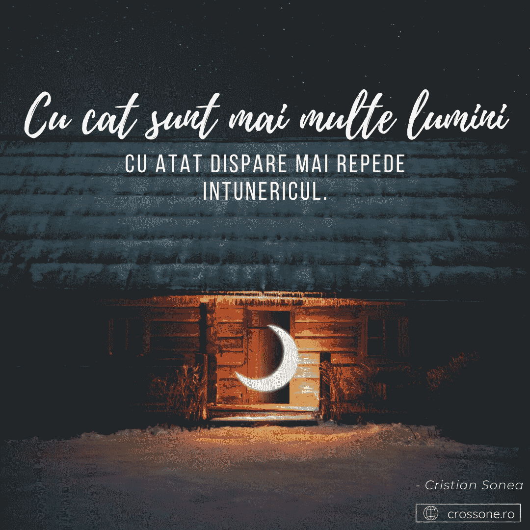 15 Martie Mar 15, 2021 | Incurajarea zilei Cu cât sunt mai multe lumini, cu atât dispare mai repede întunericul. -Cristian SoneaShare on InstagramShare on YouTubeShare on FacebookShare on EmailShare on TwitterShare on LinkedInShare on WhatsApp