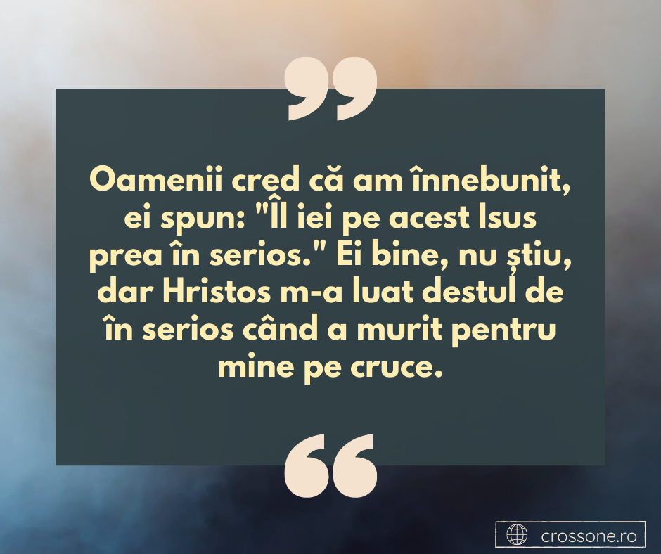 Oamenii cred că am înnebunit, ei spun: “Îl iei pe acest Isus prea în serios.” Ei bine, nu știu, dar Hristos m-a luat destul de în serios când a murit pentru mine pe cruce.