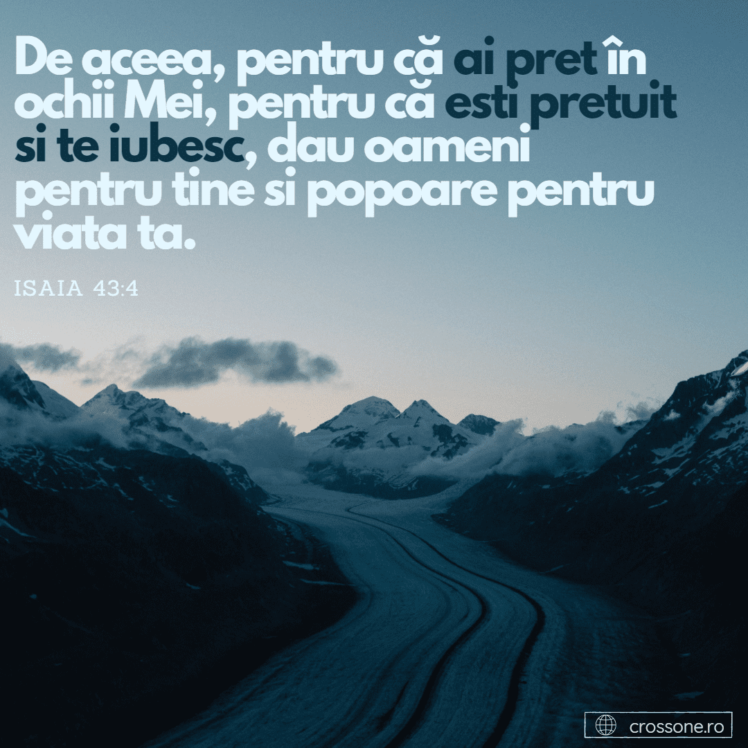 18 Septembrie 2021 Sep 18, 2021 | Incurajarea zilei De aceea, pentru că ai preţ în ochii Mei, pentru că ești preţuit și te iubesc, dau oameni pentru tine și popoare pentru viaţa ta. Isaia 43:4Share on InstagramShare on YouTubeShare on FacebookShare on EmailShare on TwitterShare on LinkedInShare on WhatsApp