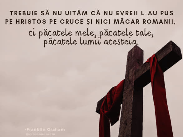 22 Aprilie 2022 Apr 22, 2022 | Incurajarea zilei Trebuie să nu uităm că nu evreii L-au pus pe Hristos pe cruce și nici măcar romanii, ci păcatele mele, păcatele tale, păcatele lumii acesteia. Share on InstagramShare on YouTubeShare on FacebookShare on EmailShare on TwitterShare on LinkedInShare on WhatsApp