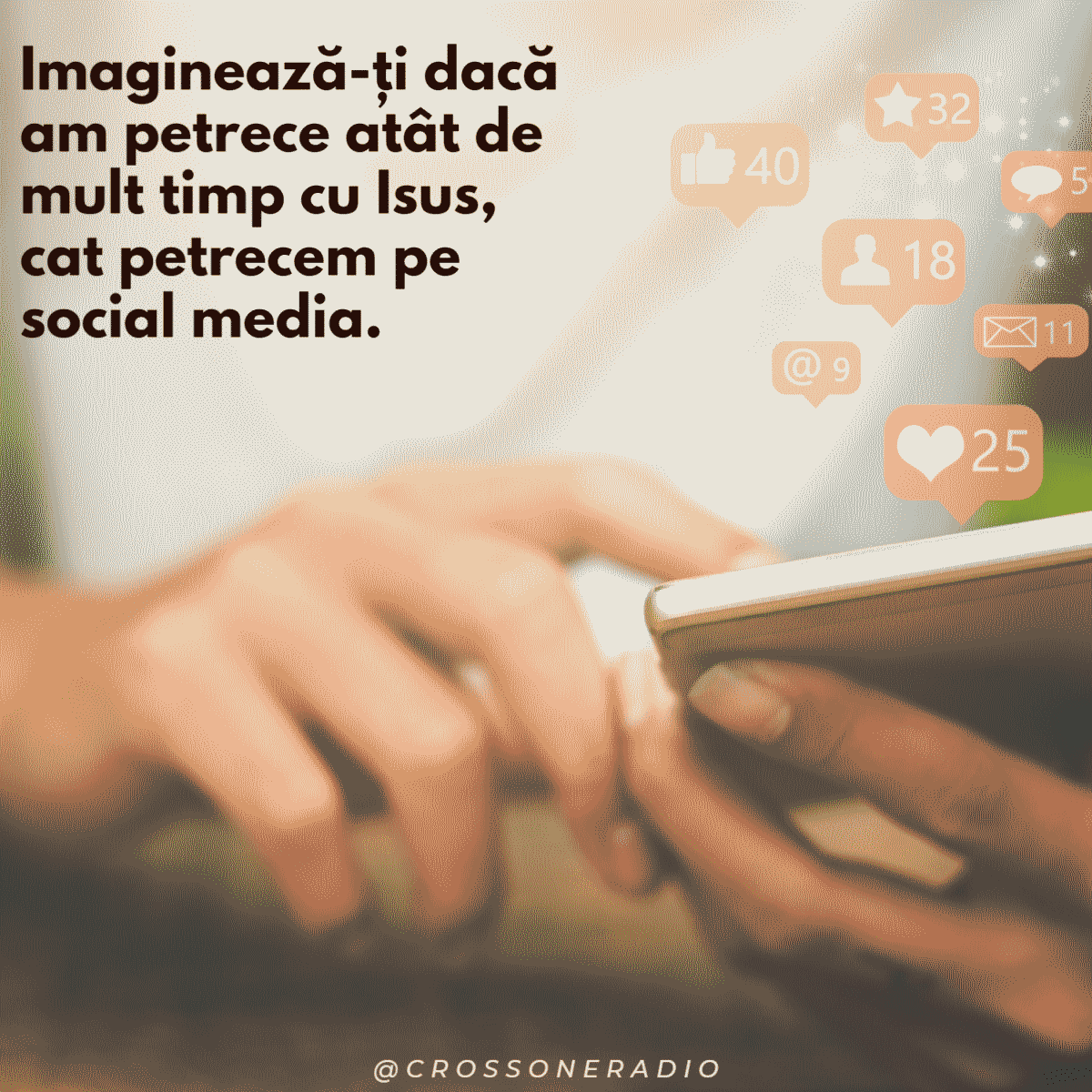 22 Februarie 2022 Feb 22, 2022 | Incurajarea zilei Imaginează-ți dacă am petrece atât de mult timp cu Isus, cat petrecem pe social media. Share on InstagramShare on YouTubeShare on FacebookShare on EmailShare on TwitterShare on LinkedInShare on WhatsApp