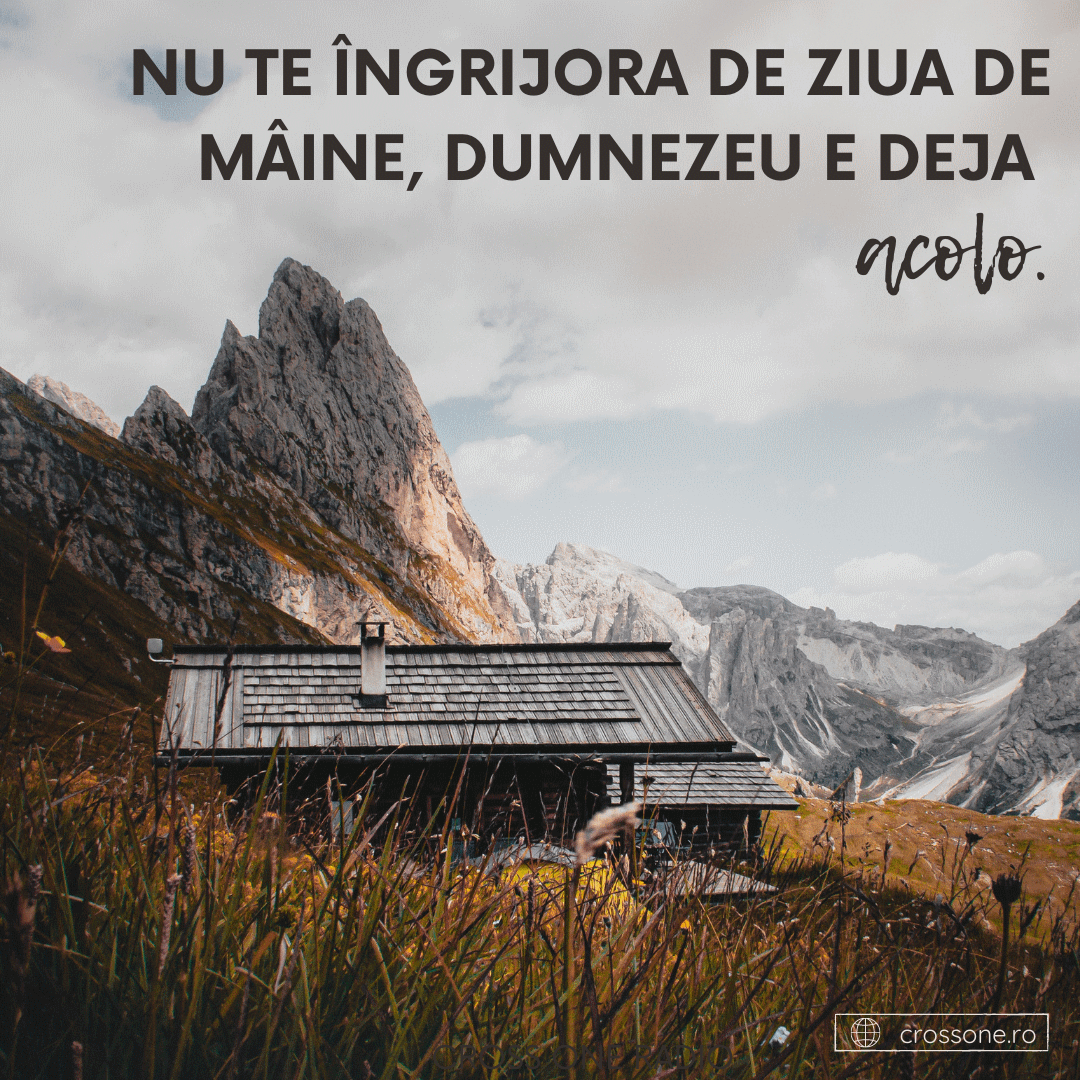 23 Martie 2021 Mar 23, 2021 | Incurajarea zilei Nu te îngrijora de ziua de mâine, Dumnezeu e deja acolo.Share on InstagramShare on YouTubeShare on FacebookShare on EmailShare on TwitterShare on LinkedInShare on WhatsApp
