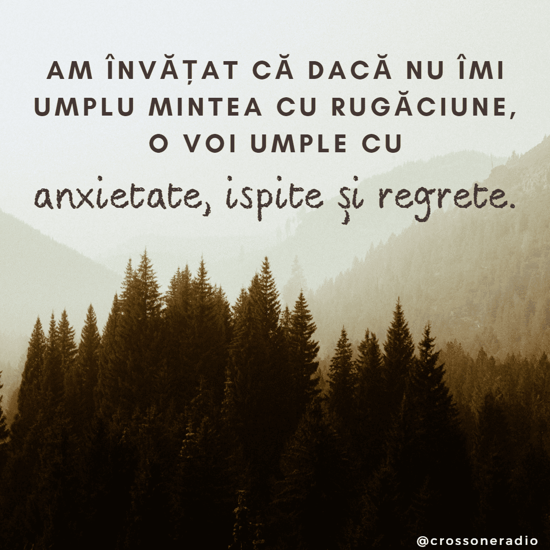 25 Ianuarie 2022 Jan 25, 2022 | Incurajarea zilei Am învățat că dacă nu îmi umplu mintea cu rugăciune, o voi umple cu anxietate, ispite și regrete.Share on InstagramShare on YouTubeShare on FacebookShare on EmailShare on TwitterShare on LinkedInShare on WhatsApp