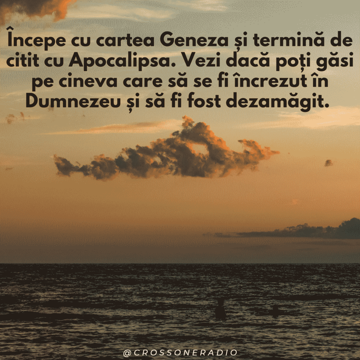 27 Februarie 2022 Feb 27, 2022 | Incurajarea zilei Începe cu cartea Geneza și termină de citit cu Apocalipsa. Vezi dacă poți găsi pe cineva care să se fi încrezut în Dumnezeu și să fi fost dezamăgit. Share on InstagramShare on YouTubeShare on FacebookShare on EmailShare on TwitterShare on LinkedInShare on WhatsApp