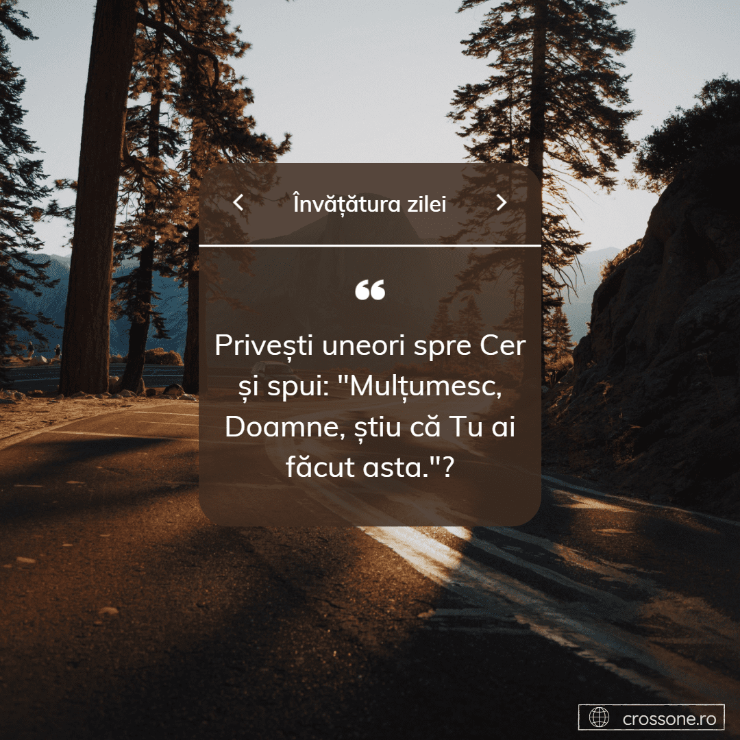 27 Septembrie 2021 Sep 24, 2021 | Incurajarea zilei Privești uneori spre cer și spui: “Mulțumesc, Doamne, știu că Tu ai făcut asta.”?Share on InstagramShare on YouTubeShare on FacebookShare on EmailShare on TwitterShare on LinkedInShare on WhatsApp