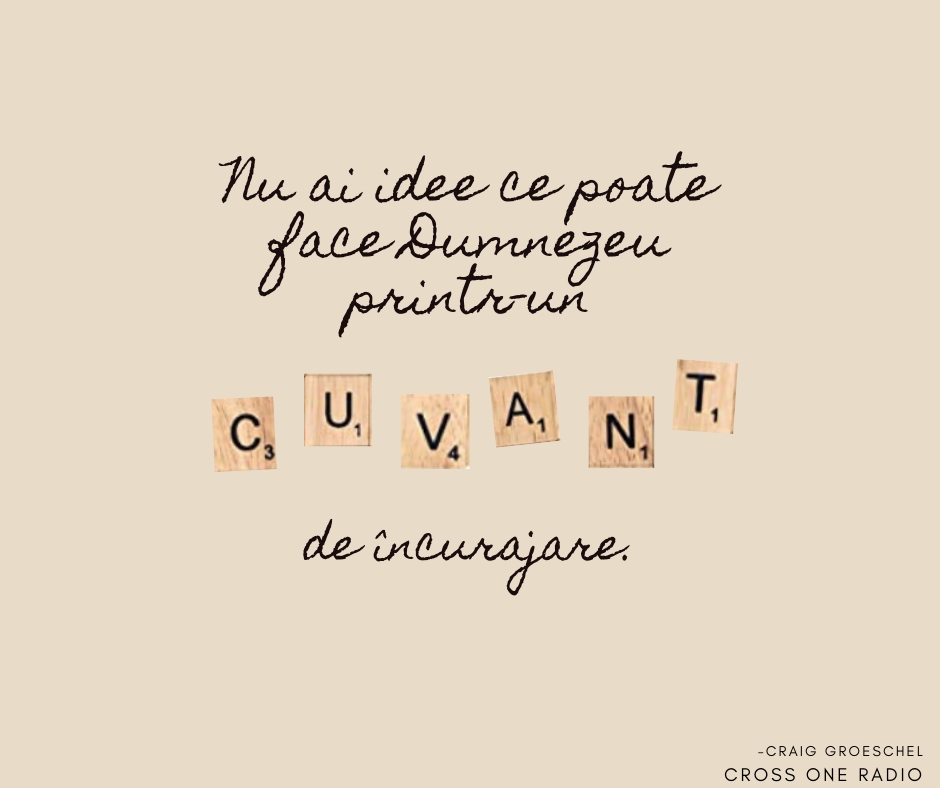 9 Noiembrie 2020 Nov 9, 2020 | Incurajarea zilei Nu ai idee ce poate face Dumnezeu printr-un cuvânt de încurajare. -Craig GroeschelShare on InstagramShare on YouTubeShare on FacebookShare on EmailShare on TwitterShare on LinkedInShare on WhatsApp
